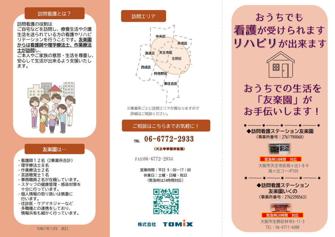 | 生野 事業所 | ■訪問看護ステーション友楽園 いくの 事業所番号:2762290563 〒544-0023 大阪市生野区林寺5-11-3 TEL:06-6711-6088 FAX:06-6711-6077 |